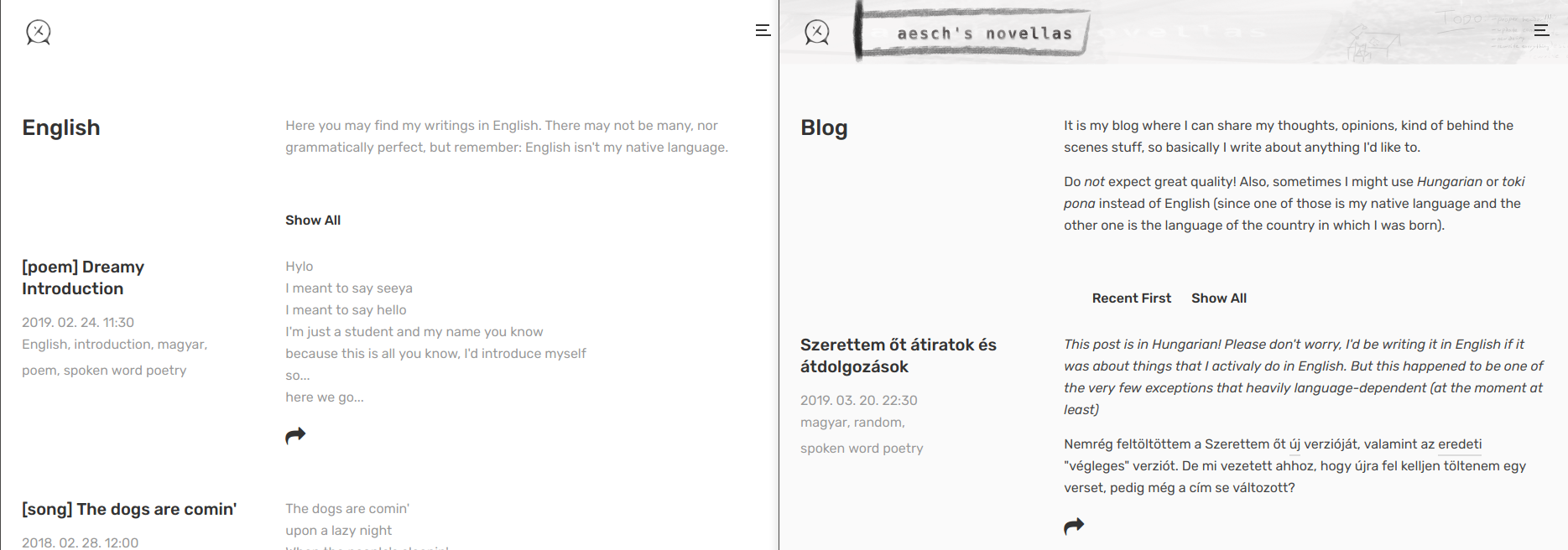 Here is an image about how my site looks with the default theme (without changing any content) and how my design looks like (or looked like as of now):